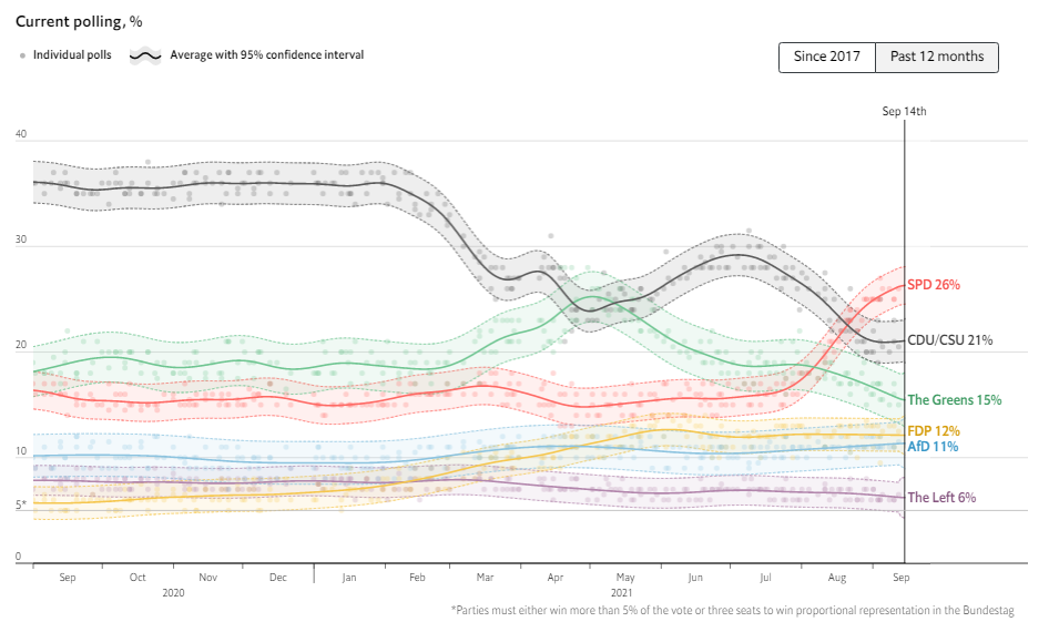 读者可能已经知道,德国将于周日(9月26日)投票选举出新的联邦议院(Bundestag)。选举的结果有各种可能性,其中一种是两个或三个政党将不得不在初步选举结果出炉后组成联盟,推选出接替担任了16年德国总理的安格拉·默克尔(Angela Merkel)的人选。