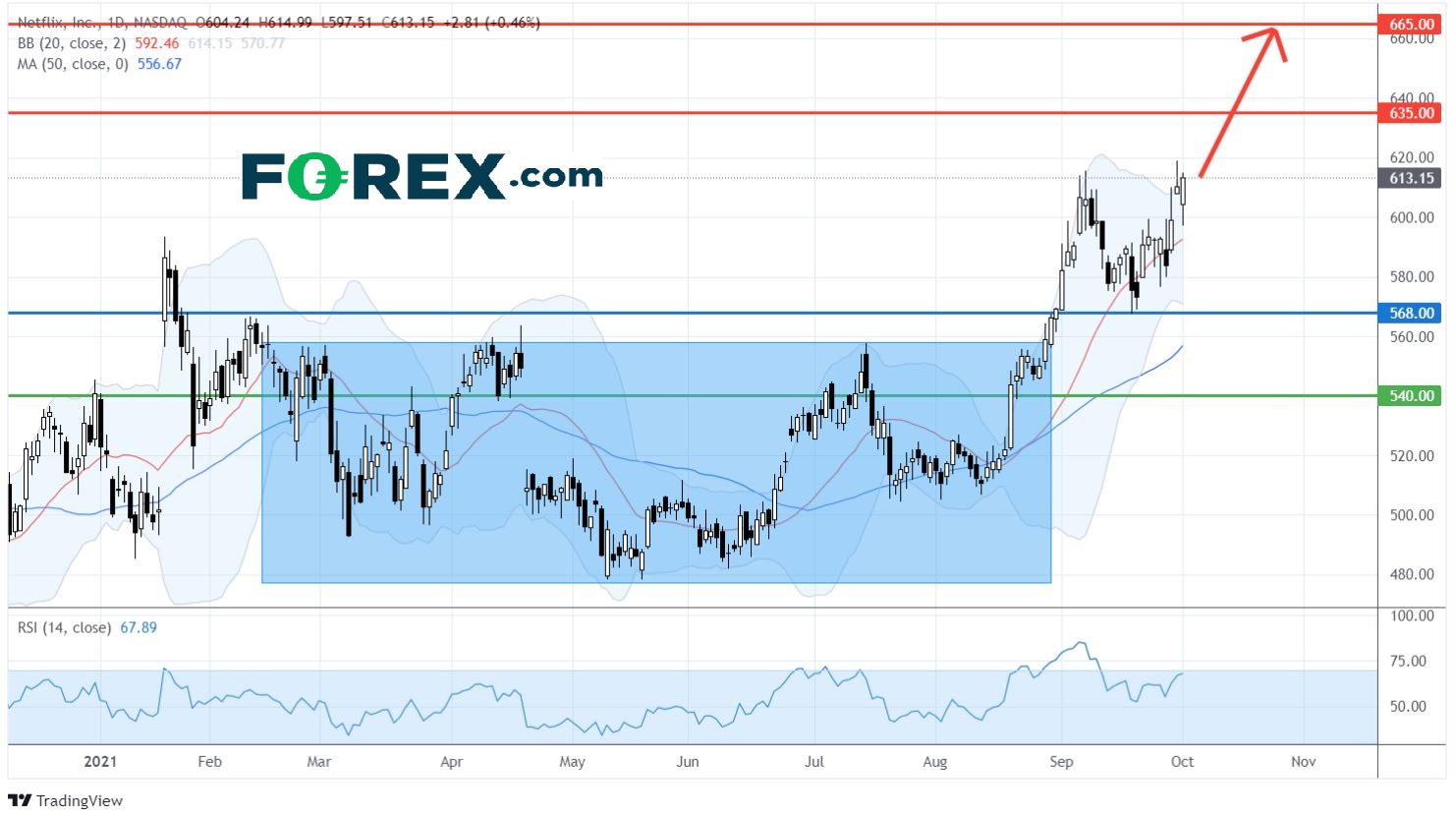 无惧美股持续整固,网飞 (NFLX) 仍在高位操作; 消费者类股票 可口可乐 (KO)、麦当劳 (MCD)、好市多 (COST)、Visa (V) 走势各异   网飞 Netflix (NFLX.US) : 再创新高,目标价665美元   來源:GAIN Capital,TradingView   美国龙头串流媒体播放平台 网飞Netflix (美股编号: NFLX) 计划在10月19日公布第三季度业绩。   公司预计第三季度销售额为74.8亿美元 (与华尔街分析师预测相若),每股收益为2.55美元 (华尔街分析师预测为2.26美元) 。去年同期,网飞的销售额为64.4亿美元,每股盈利1.79美元。     关於付费订户数量,网飞预计第三季度将增加350万新订户,低於分析师一直预测的563万。网飞指出,预计订户增加放缓,是因为经济在冠状病毒大流行后重新开放,对媒体串流的需求或有影响。   自从开始原创内容推广以来,网飞已经推出了相当多的热门节目。其中包括《奇怪的事Stranger Things》、《抢钱Money Heist  》、《布里奇顿Bridgerton》和《巫师The Witcher》。   上周,韩国互联网服务提供商SK Broadband 起诉网飞,要求其赔偿由于观看《鱿鱼游戏Squid Game  》的人数激增而增加的网络流量和维护工作带来的成本。《鱿鱼游戏Squid Game  》是一部虚构的韩剧,讲述了穷人为了现金奖赏,在暴力的挑战中展开互相竞争。   SK Broadband指出,网飞 及谷歌 Google的YouTube是两家唯一不支付网络使用费的公司,而 亚马逊 Amazon.com、苹果 Apple和 脸书Facebook等其他内容提供商正在支付这一费用。   从侧面看,这事件可反映出网飞的原创作品在南韩十分受欢迎。   然而,当在美国股市正在经历盘整阶段的同时,网飞的股价却持续上行。   在日线图上,网飞的股价仍然做好,在上周四 (9月30日) 再创下历史新高619.00美元。   股价已跳离20日移动均线,并衝破了布林带上线。相对强弱指标也爬升回60点以上,显示股价仍具上行动能。   很明显,技术格局仍以看涨为主调。预期股价可再创历史新高,上衝635.00美元。另一上行目标为665.00美元。   看涨的主要支持 (止损) 位已再次调升至568.00美元 (在布林带下线附近)。     可口可乐 (KO.US):下行压力增强,先看50.90美元 来源:GAIN Capital,TradingView   跨国饮料生产商 可口可乐 Coca-Cola (KO) 股价9月跌6.8%至5个月低点,跌幅为1月以来最大。该股今年迄今转跌4.3%,跑输道指同期10.6%的涨幅。   可口可乐预料将于今月下旬公佈第三季业绩。据彭博调查,市场预测经调整每股盈利为0.57美元,上季及去年同期分别为0.68美元及0.55美元。全年经调整每股盈利预测为2.25美元,以现价计算,相当于约23倍市盈率。   彭博分析师表示,餐厅客人流量的增加将推动饮料消费反弹,但较高的市场推广开支或会抑制该公司的营业利润率。   从技术角度看,如日线图所示,可口可乐股价的下行压力有所增强。它跌破了去年7月以来的上升趋势线,并进一步远20日及50日移动均线。   看跌的投资者可将55.50美元视为主要阻力 (止损) 位,下行目标在50.90美元及49.30美元。     麦当劳McDonald's (MCD.US):温和上涨,首目标249美元 来源:GAIN Capital,TradingView   全球知名快餐品牌 麦当劳McDonald's (MCD) 股价在9月反弹1.5%,今年迄今涨幅达13.2%,跑赢道指同期10.6%的涨幅。   麦当劳将于10月27日公佈第三季业绩。根据彭博,分析师预测第三季经调整每股盈利为2.45美元,上季及去年同期分别为2.37美元及2.22美元。全年经调整每股盈利预测为9.05,以现价计算,相当于约27倍市盈率。   投资银行摩根大通给予麦当劳「增持」评级,指出该公司继续利用其快速增长的数字平台来执行得来速及送货策略,结合强劲的营销计划,使该品牌能够轻松地将2021年的全球系统销售增长目标从先前的中双位数提高到高双位数。   在日线图上,麦当劳股价保持着温和的上升趋势。目前,它受到3月以来的上趋势线支撑,并在20日及50日移动均线上方交投。   只要主要支持 (止损) 位234美元不破,股价可望挑战上方目标249美元及256美元。   好市多Costco (COST.US) : 主要支持位在431美元   來源:GAIN Capital,TradingView   美国零售巨头  好市多Costco  (COST) 的股价年初至今上涨约19%,表现接近标准普尔500指数。   公司在上周公佈2021财年第4季度业绩,每股盈利由去年的3.13美元上升至3.76美元,胜市场预期。营业额按年上升15%至历史新高614.4亿美元,符合市场预期。   此外, 花旗银行Citigroup将好市多的目标价由460美元上调至495美元,评级维持「持有」。   在日线图上,股价上升至52週新高471美元后展开整固,相对强弱指数亦回落至中性水平50附近的位置,表示动能正在减弱。股价下试50日均线后,阴阳烛出现锤头的形态,显示好淡双方正在角力。   由于股价仍在52週高位附近交投,技术走势仍偏向完成整固后会再次带来升浪。只要股价能守在主要支持 (止损) 位431.00美元 (费波纳奇的回撤比率23.6%) 的上方,股价可上望471.00美元和490.00美元。   若下破431.00美元则会引发更深的调整至414.00美元。   Visa 公司 (V.US) : 反弹势头渐形,料先见242.50美元   來源:GAIN Capital,TradingView   美国信用卡公司 Visa (V) 年初至今仅升约5%,表现弱于标准普尔500指数。   公司预计于10月尾公佈21年财年第4季度业绩,市场预期每股盈利将按年上升37.3%至1.537美元,营业额预计按年增长34.3%至65亿美元。   最近,公司总裁Ryan Mcinerney于10月1日卖出11,194股Visa的股票,交易金额约256万美元。   在日线图上,股价由近期低位216.30美元反弹