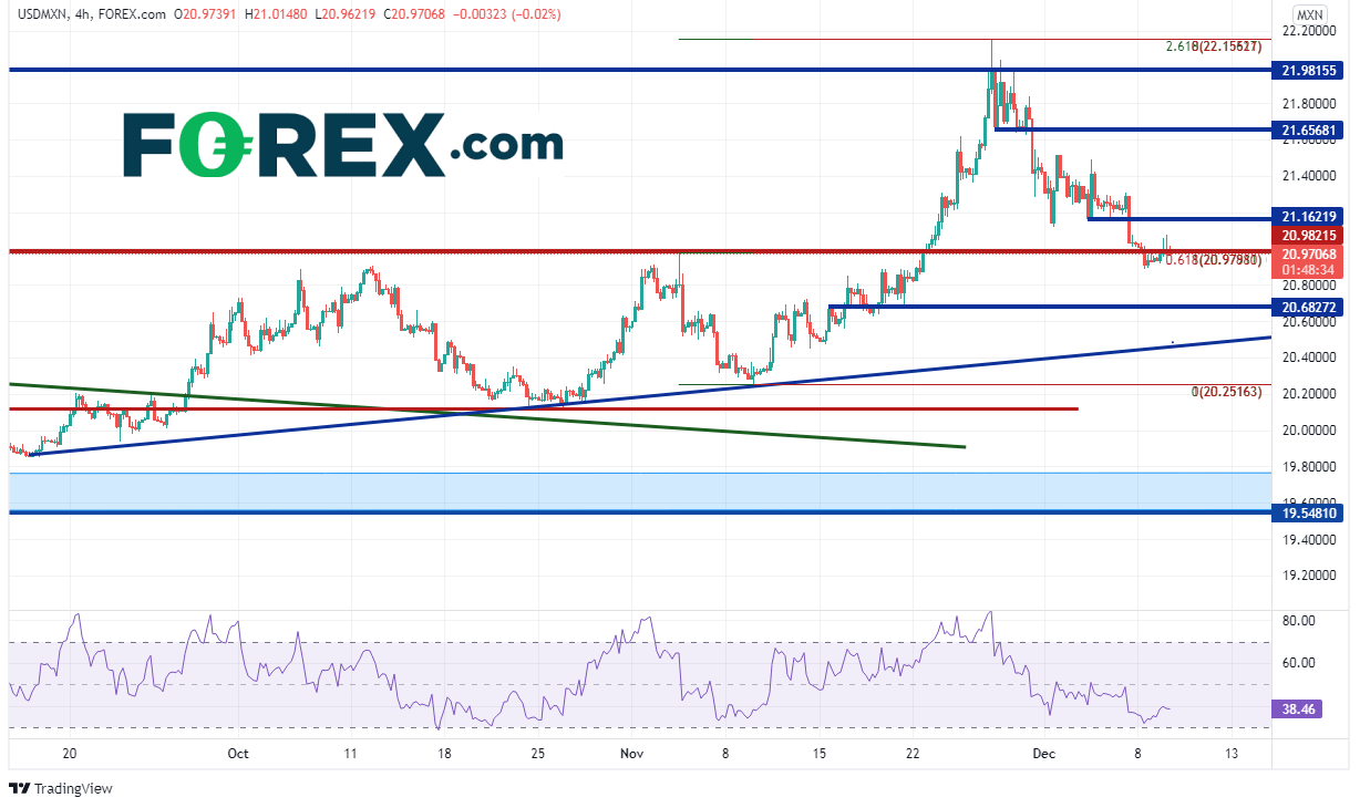 美元/墨西哥比索过去一年似乎一直处于一个筑底形态中,始终守住19.549119.7464支撑区域。该支撑区域多次遭到考验,但每次都经受住了考验。该货币对于928日站上20206月以来的下降趋势线所在的20.30附近,此后再没跌破该位。1126日,价格摸至20213月高点到20216月低点的127.2%扩展位,即22.18附近,RSI进入超买区域,价格涨势也随之止步。上破22.00的水平阻力位也属“虚晃一枪”,此后价格回落至21.00的强水平支撑位。