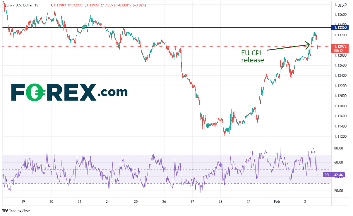 欧元/美元15分钟图在CPI发布后自1.1293急涨至短线阻力1.1335,后在获利回吐盘的打压下回到CPI发布前的水平。交易者是否在周四的央行会议召开之前获利回吐?这点值得思考。