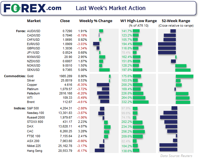 美国股市上周最终收低2%-3%,但波动性有所减弱,当周高低点区间低于其10周指数移动均线。目前我们预测市场继续震荡,投资者保险起见可以二择一:缩短持有时间,灵活应对;离场观望,直到传统市场力量回归。今天期货市场尚未开盘,但从周末俄罗斯袭击北约成员国波兰的边境军事空军基地的消息来看,投资者不大可能重振信心。