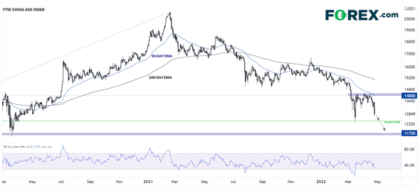如下图所示,该指数在去年2月最高站上20,000,此后不断下跌,上月触及2019-2021年反弹行情的78.6%回档位附近,即12,400一线。在14,000下方盘整5周后,富时中国A50指数本周再度调头向下,可能很快回踩数年低点。