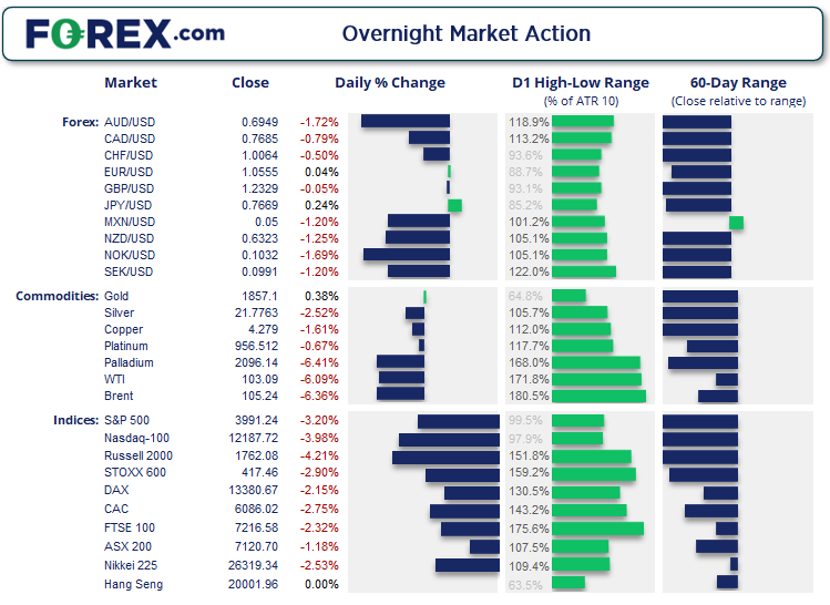标普500指数14个月中首度收于4000下方,所有板块承压下挫,能源板块领跌,85%的个股走弱。纳斯达克100指数收于关键支撑位下方,跌至202011月以来最低点。